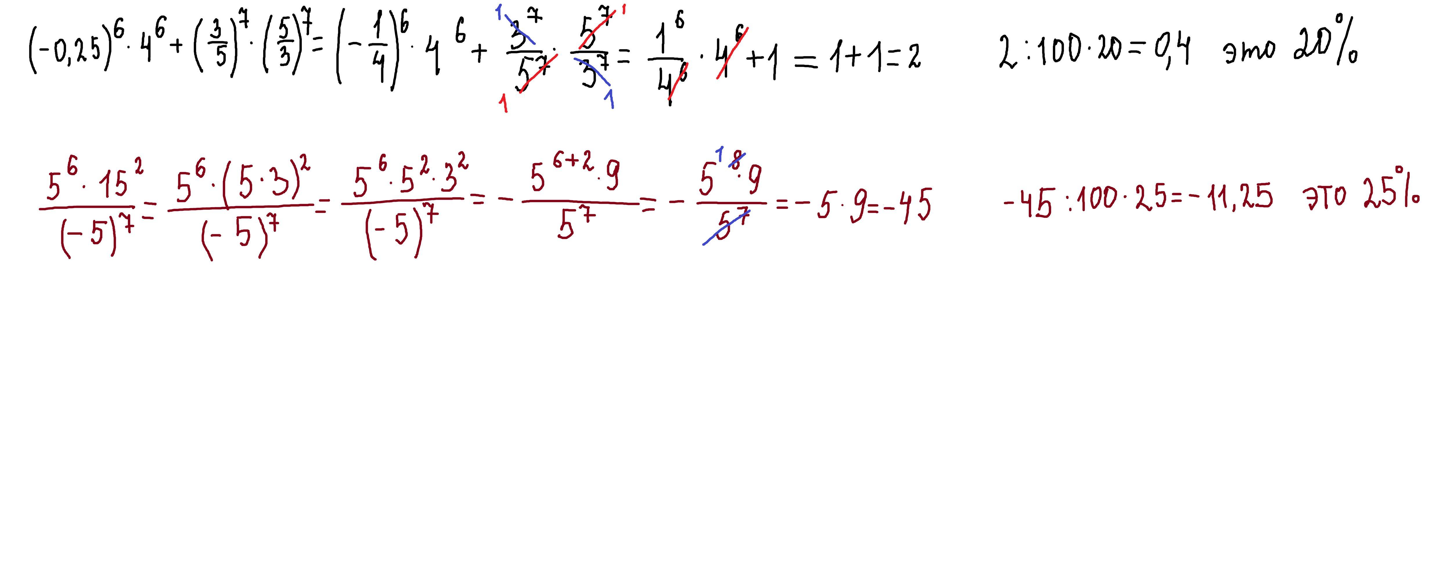 СРОЧНО Что больше: 20% от (-0.25)⁶ * 4⁶ + [(frac{3}{5} )] * [(frac{5}{3} )] или 25% от [frac{5^{6} * 15^{2} }{(-5)^{7} }]