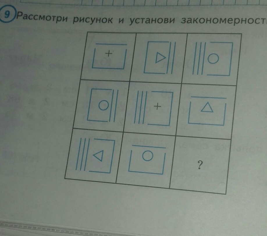 3 признака: треугольник, круг или + Полоски(1,2,3) Наверх ,право, лево В пропущеном квадрате будет +,2 полоски и повернут на право