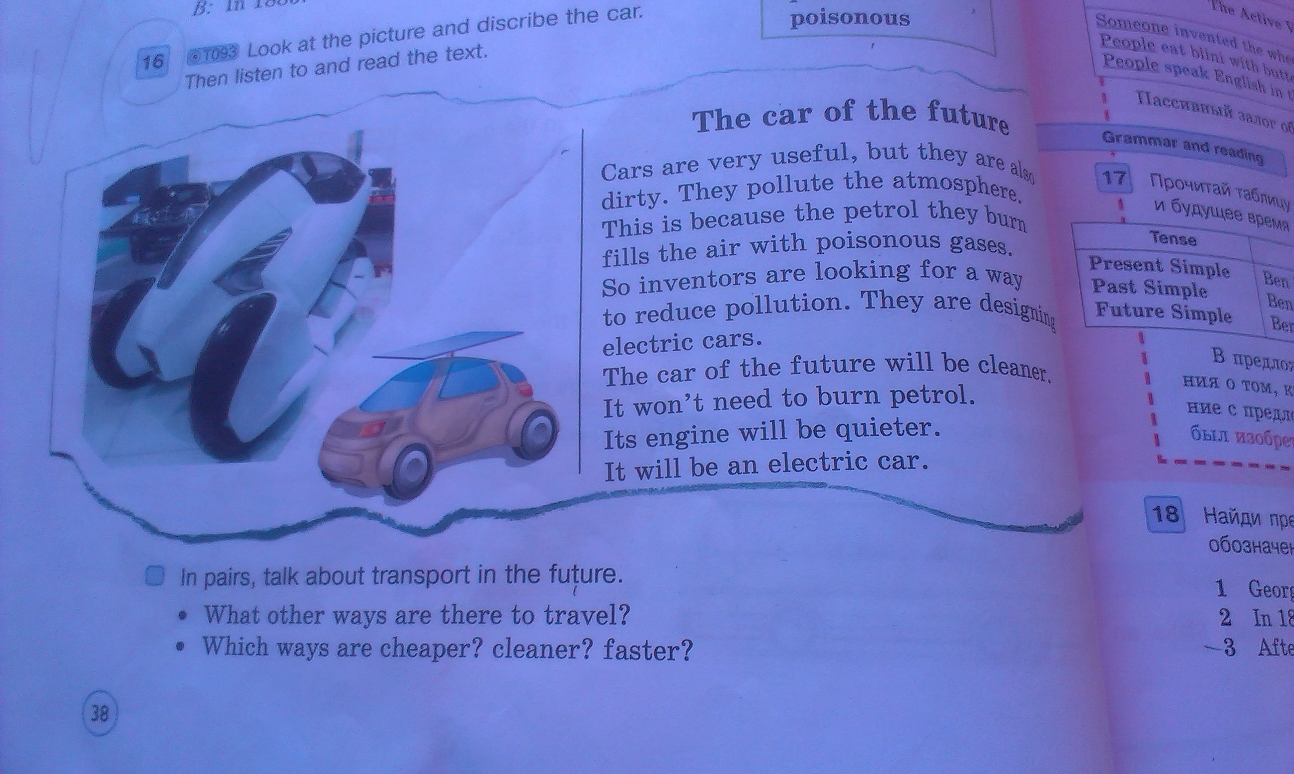 Автомобили очень полезны, но они также грязны. Они загрязняют атмосферу. Это вызвано тем, что бензин, который они жгут, заполняет воздух ядовитыми газами.
