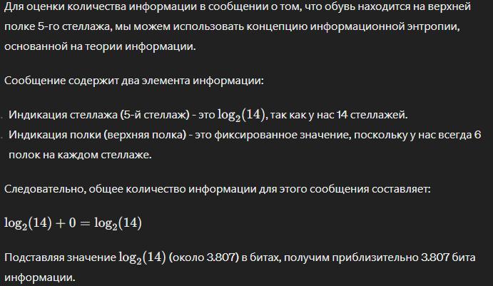 На складе располагается 14 стеллажей. На каждом стеллаже 6 пол(-ки, -ок). Какое количество информации содержит сообщение, что обувь находится на верхней полке 5-го стеллажа?