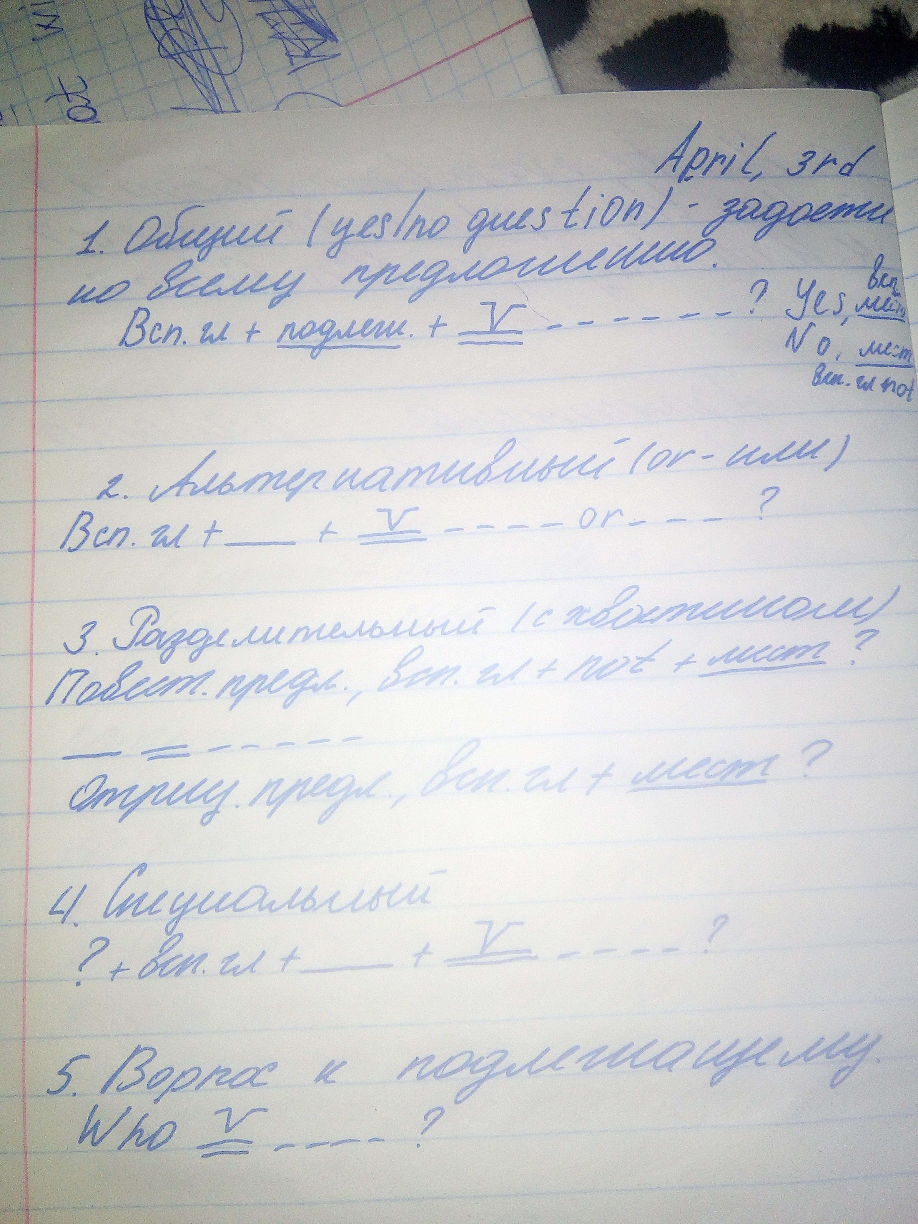 Вспомогательный глагол will перемещается в начало предложения перед подлежащим people.Со вспомогательным глаголом происходит то же самое, что и в п. 1, к дополнению plants добавляется союз or и ещё одно дополнение (animals, животных)После утвердительного предложения пишется отрицательный вспомогательный глагол от will (здесь это won’t) и местоимение (they), заменяющее подлежащее.Перед вопросительным предложением (см. пункт 1) ставится вопросительное слово к обстоятельству (где (where), когда (when), почему (why) и т.д.).Из предложения убирается подлоежащее people, в начале ставится вопросительное слово who (если бы там было что-то неодушевлённое, то в начале нужно было бы ставить what). Внимание: месотимение who всегда единственного числа.