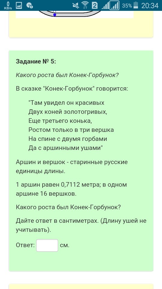 В сказке говорится что конек 3 вершка, один аршин 0,7112 но в нём 16 вершков 0,7112÷16=0,4445(од.верш.)
