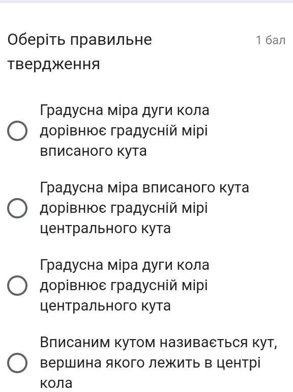 Градусна міра дуги кола дорівнює градусній мірі центрального кута.