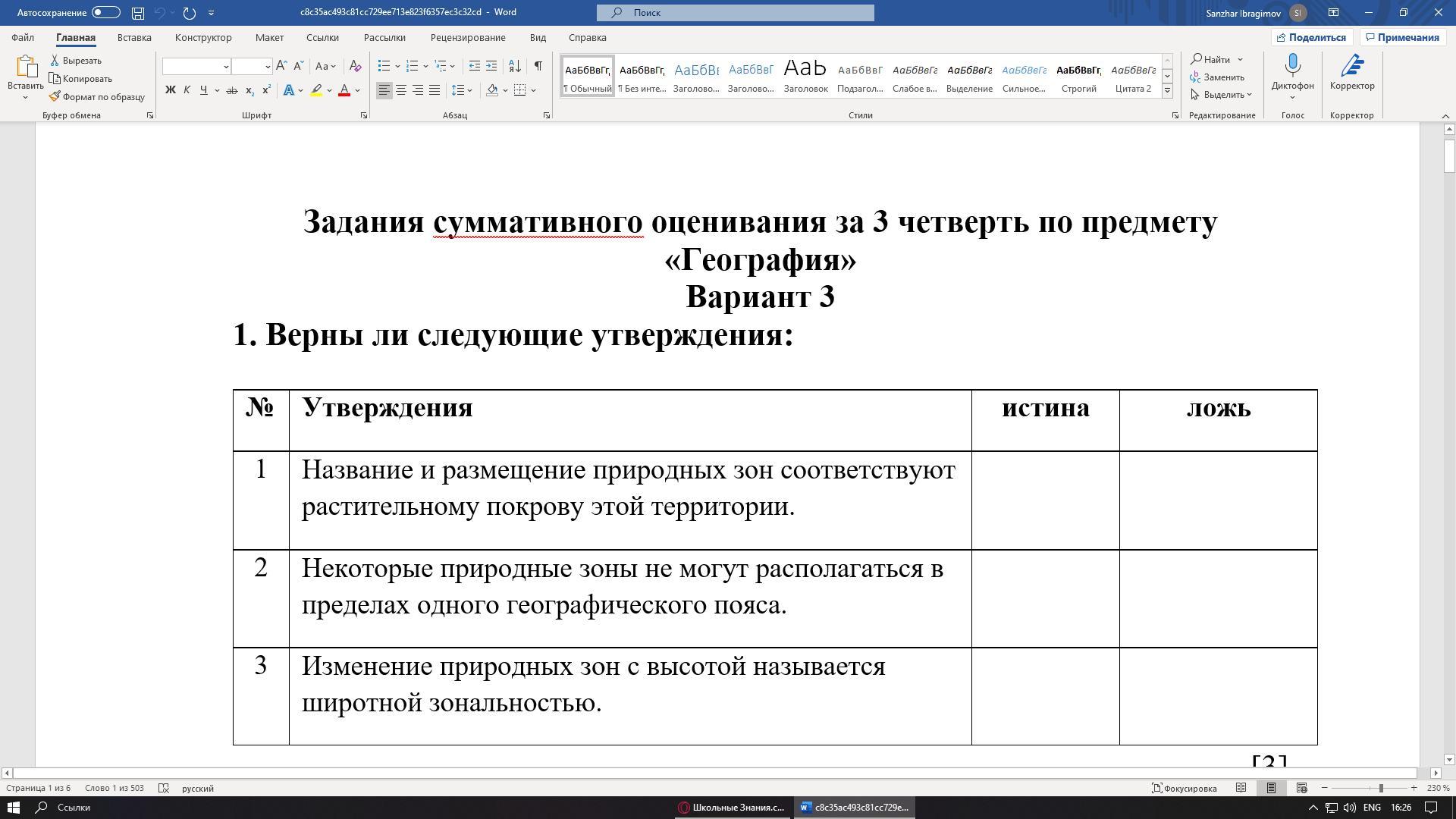 Определите истинные/ложные утверждения, отметьте их знаком «V» Утверждения: 1 Ледники в горах Казахстана…