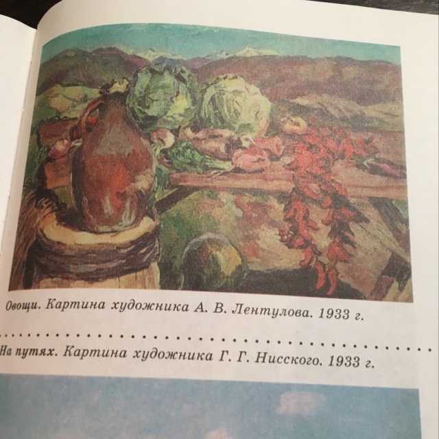В картине А. Лентулова «Овощи» на первом плане изображена бочка с глиняным кувшином, дощатый пол с кочанами капусты, красным перцем и другими овощами. А дальше зеленеет луг, видны сиреневые горы с далекими облаками на фоне синего неба. Теплые блики чередуются с холодными отсветами неба. Чувствуешь, что капуста свежа и если ее тронуть, то звонко захрустит, что перец и редиска упруги и ароматны.