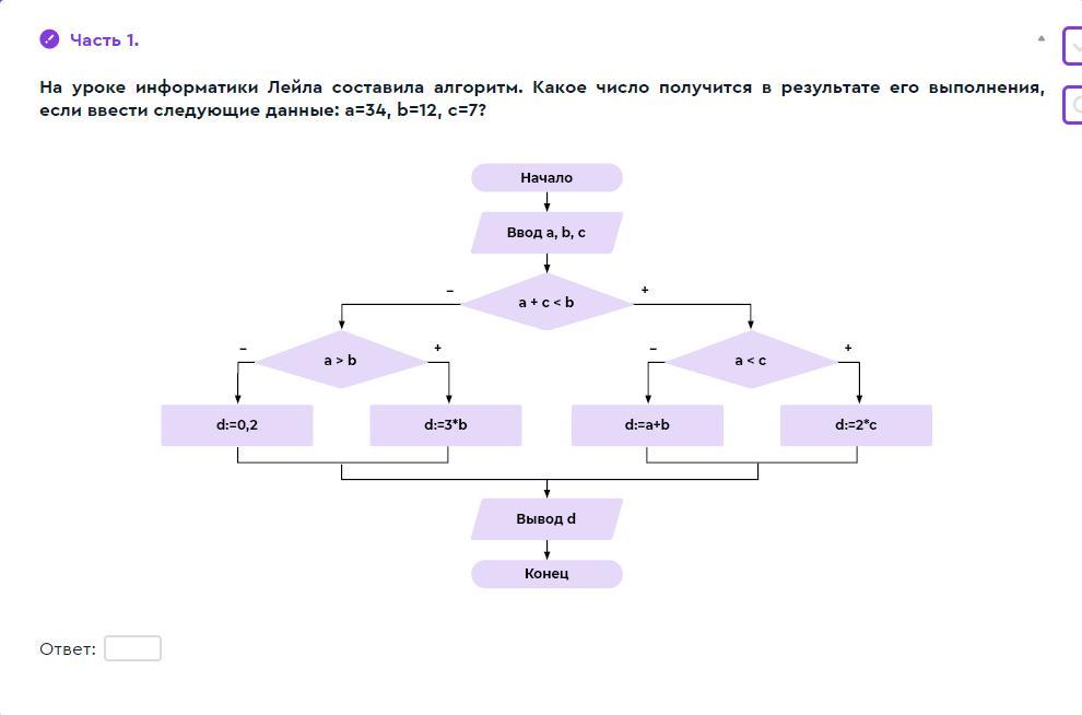 На уроке информатики Лейла составила алгоритм. Какое число получится в результате его выполнения, если ввести следующие данные: a=34, b=12, c=7?