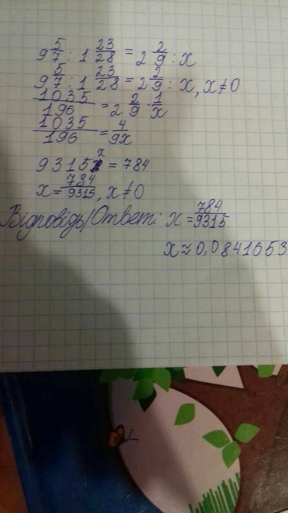 9 5/7 : 1 23/28 = 2 2/9 : x
