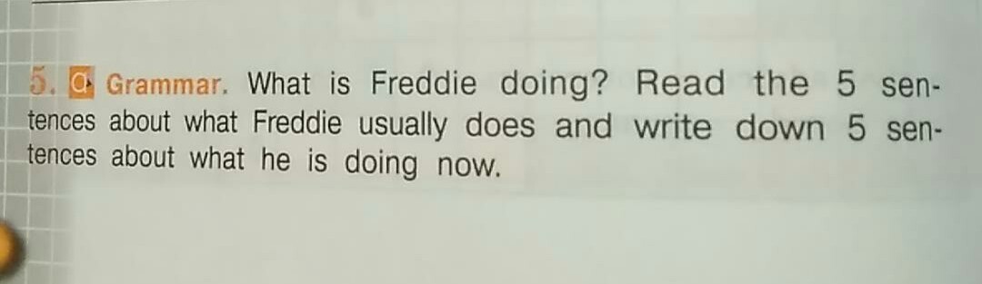 Что делает Фредди? Прочитай 5 предложений о том что Фредди обычно делает и запишите 5 предложений о том что он делает сейчас.