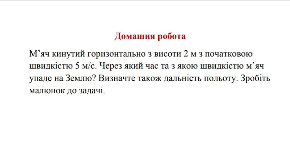 В момент падения t=tп y(tп)=0, тогда из второго tп=√(2*Ho/g)= √(2*2/10)=0.632c, дальность из первого L=5*0.632=3.16 м, скорость Vy=-g*tп=-6.32 м/с