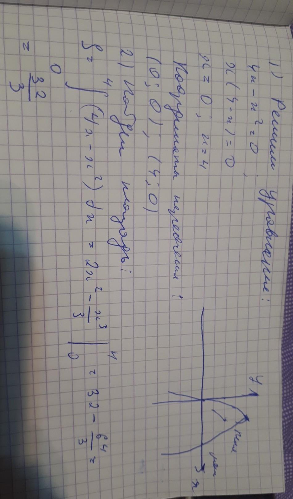 На схеме, в системе координат Оху, излучина реки образует кривую у=4х-х^2 . По оси Ох проходит шоссе. Найдите координаты пересечения реки и шоссе и вычислите, какую площадь занимает пашня между рекой и линией шоссе.