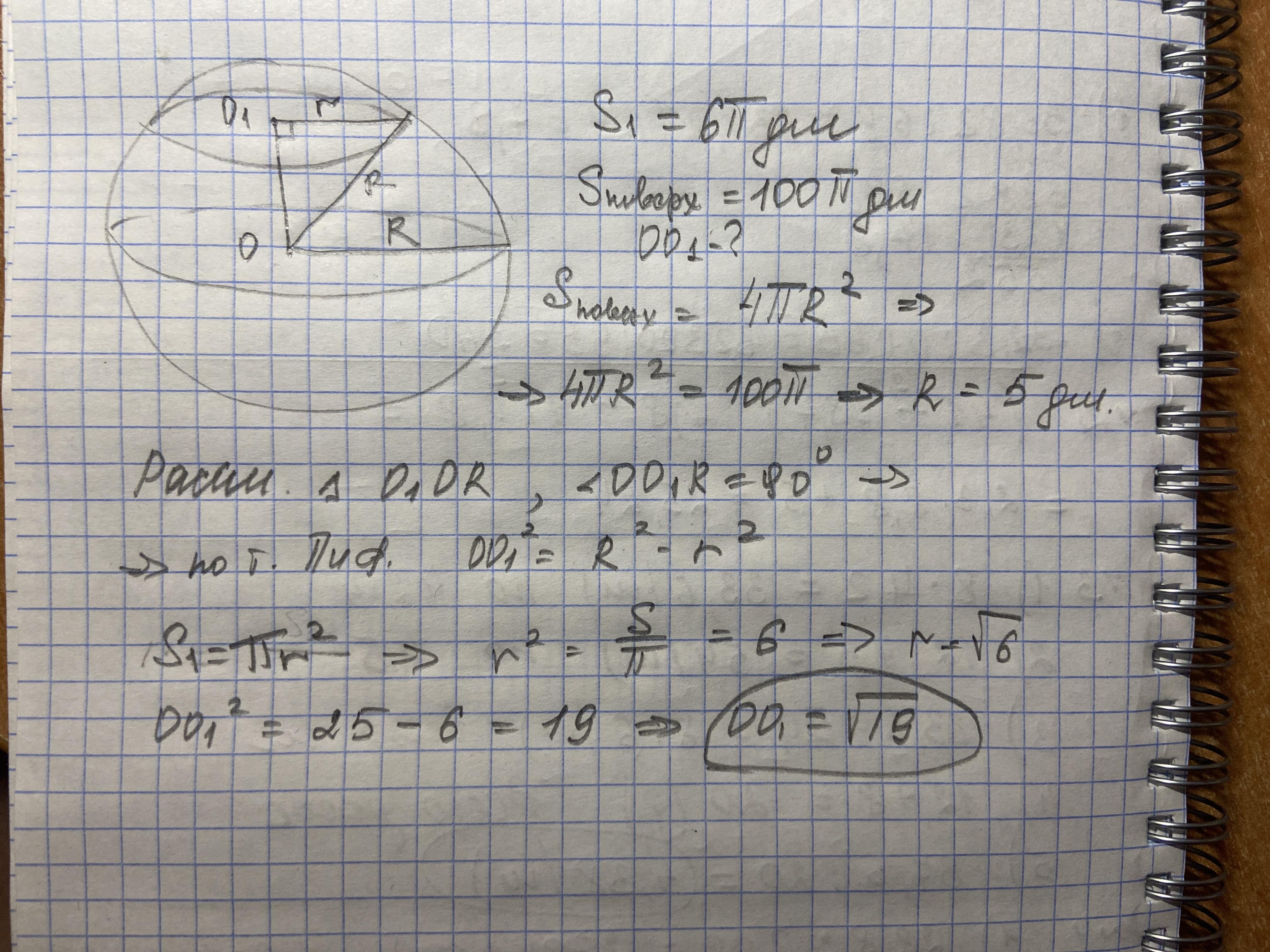 Длина окружности сечения шара плоскостью 6пи дм.Найдите расстояние от плоскости сечения до центра шара,если площадь боковой поверхности шара 100пи дм.