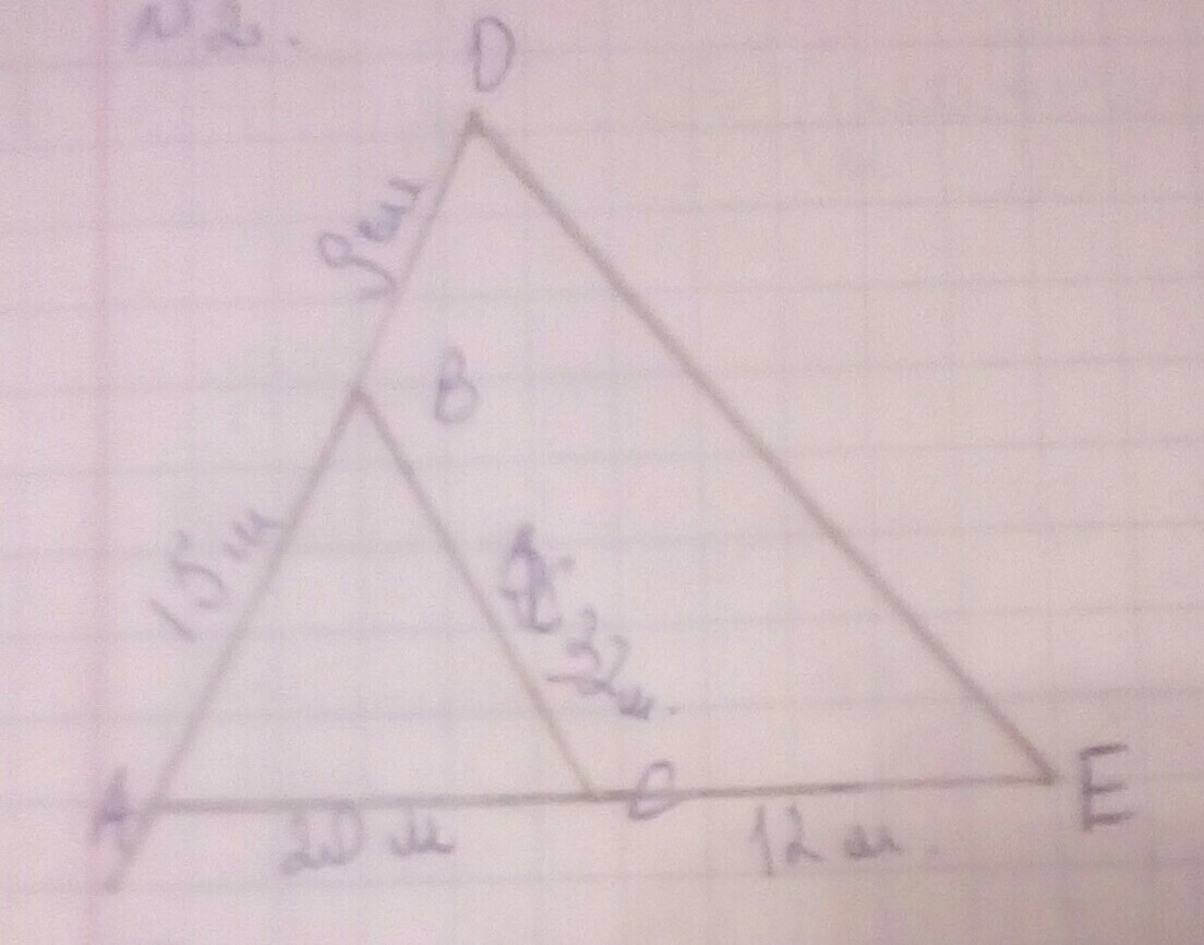 Отношение площадей подобных треугольников равно квадрату коэффициента подобия. Коэффициент подобия — отношение сходственных сторон. Значит к= AC/AE=20/32=5/8, значит BC/DE=5/8, отсюда DE= 12*8/5=19,6