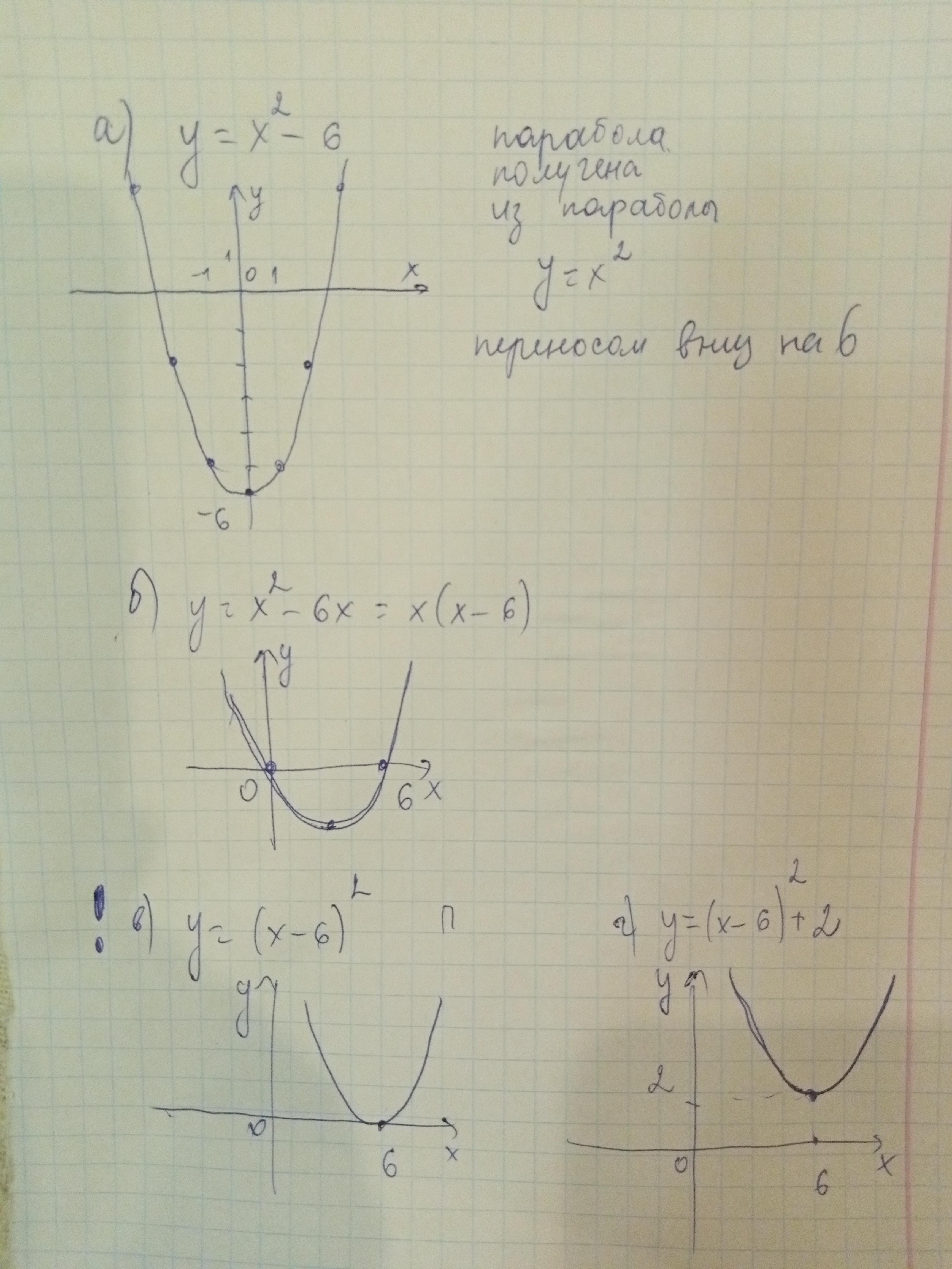 Г) парабола получена переносом параболы y=x^2 на 6 ед. вправо и на 2 ед. верх. Вершина не лежит на оси абсцисс.