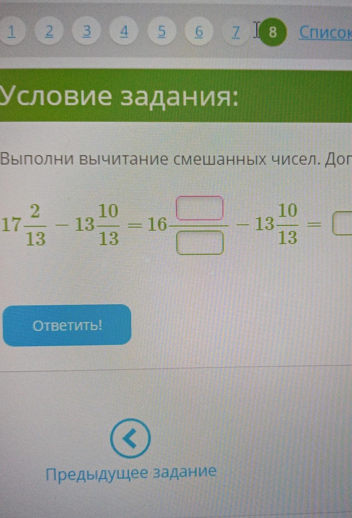 Задача по ПОМОГИТЕ ПОЖАЛУЙСТА БУДУ ОЧЕНЬ БЛАГОДАРНА ФОТО ПРИКРЕПЛЕНО Выполни вычиатния смешанных чисел. дополни решение для школьников 5 - 9 класс. Узнайте подробное решение и обсудите его с другими участниками. Ответы на этот вопрос уже добавлены. Здесь можно не только получить помощь, но и стать экспертом, помогая другим пользователям.