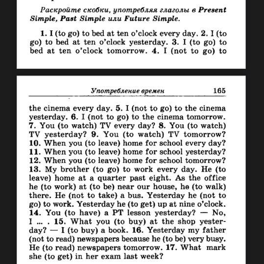 1. go 2. went 3. will go 4. don’t go 5. didn’t go 6. won’t go 7. Do you watch 8. Did you watch 9. Will you watch 10. When do you leave 11. When did you leave 12. When will you leave 13. goes leaves works is walks doesn’t take didn’t go got 14. Did you have . ? — No, I didn’t.