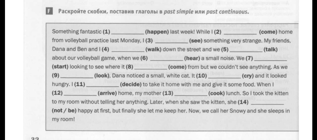 Something fantastic (1). (happened) last week! While I (2) (was coming) home from volleyball practice last Monday. I (3) (saw) something very strange. My friends Dana and Ben and I (4) were (walking) down the street and we (5) were (talking) about our volleyball game, when we (6) (heard) a small noise. We (7) (started) looking to see where it (8) was (coming) from but we couldn’t see anything. As we (9) were (looking), Dana noticed a small white cat. It (10) (was crying) and it looked hungry. I (11) (decided) to take it home with me and give it some food. When I (12) (arrived) home, my mother (13) (was cooking) lunch. So I took the kitten to my room without telling her anything. Later, when she saw the kitten. she (14) (was not) happy at first.