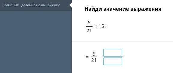 5/21 : 15 = 5/21 * 1/15 = 5*1/21*15
