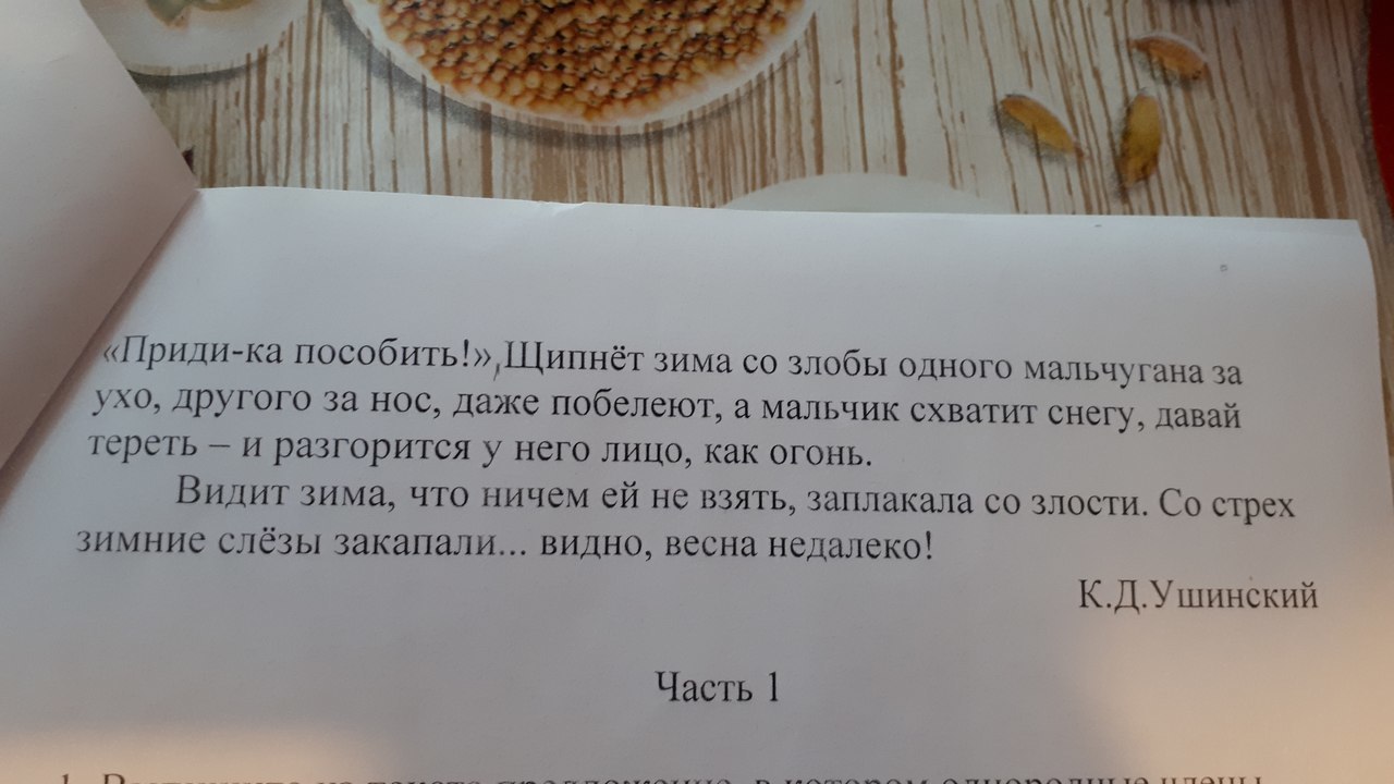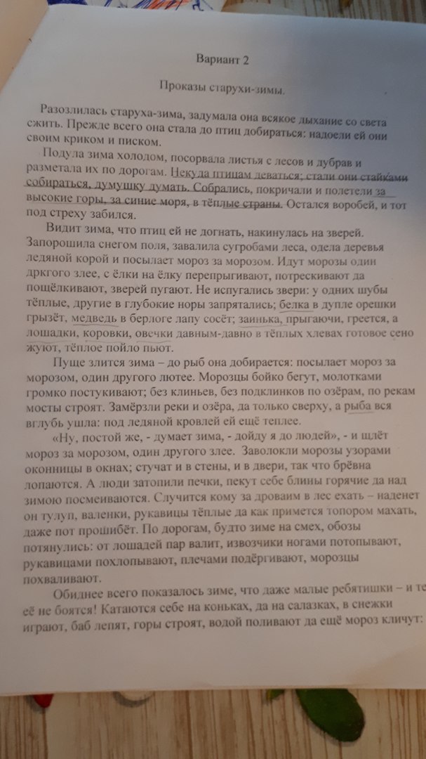 10. Прочитай текст. Проказы старухи-зимы (За)думала зима всякое дыхание (co)света (с)жить. Прежде всего ста- ла она (до)птиц (до)бираться: надое- ли они ей своим криком и писком. (По)дула зима холодом, (со)рва- ла листья (с)лесов и разметала их (по)дорогам. Нéкуда птицам девать- ся. Стали они стаями собираться. (По)кричали и (по)летели в тёплые страны. Остался воробей, да и тот (под)крышу (за)бился. (По К. Ушинскому) • Как ты понимаешь заглавие текста? Какой это текст: художественный или научно-познавательный? Какой приём автор использует в тексте? Нарисуй словесный портрет этого времени года по прочитанному тексту. • Вспомни, чем отличаются предлоги от приставок. Как они пишутся? • Спиши текст. Подчеркни предлоги, выдели приставки. фото-