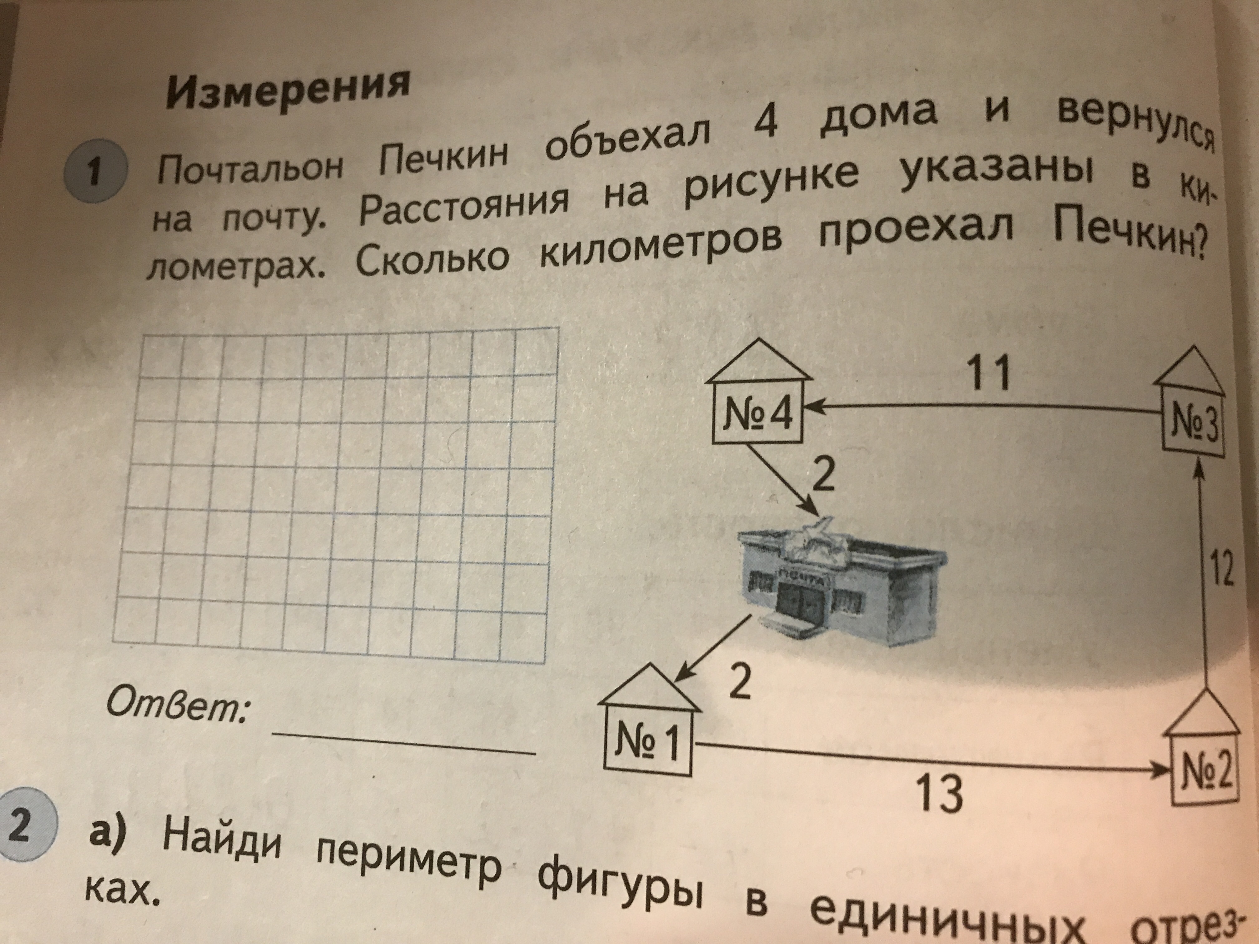 Страница 12 номер 1.Почтальон Печкин объехал 4 дома и вернулся на почту. Расстояния на рисунке указаны в километрах. Сколько километров проехал Печкин?