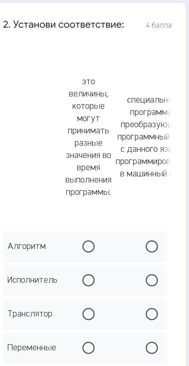 Задача по Установи соответствие: 4 балла это величины, которые могут принимать разные значения во время выполнения программы.специальная программа, преобразующая программный код с данного языка программирования в машинный кодэто человек, животное или машина, которые могут понимать и выполнять определенные командыэто упорядоченный набор инструкций, описывающих порядок действий исполнителя для достижения им результата или для решения поставленной задачи. Алгоритм Исполнитель Транслятор Переменные Алгоритм Исполнитель Транслятор Переменные для школьников 5 - 9 класс? Читайте обсуждения и ответы на тему Математика. Ответы на этот вопрос уже есть. Присоединяйтесь к нам, задавайте вопросы и делитесь своими знаниями с другими участниками.