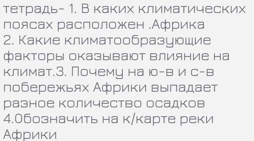 1) Африка находитс в экваториальном, в двух субэкваториальных, двух тропических(всего в 7ми поясах)