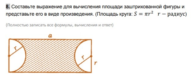 Площадь заштрихованной фигуры равна площади прямоугольника со сторонами «а» и «2r » ( S₁=a*2r=2ar ) без площади двух одинаковых полукругов, что в сумме даёт площадь целого круга ( S₂=πr² ) :