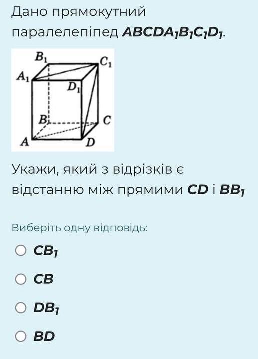 Ищете помощь с задачей по Укажи, який з відрізків є відстанню між прямими CD і BB1? Узнайте, как решить задачу для школьников 10 - 11 класс и читайте обсуждения от других участников. Ответы уже опубликованы. Не забывайте, что вы можете задать свой вопрос или стать экспертом, помогая другим пользователям.