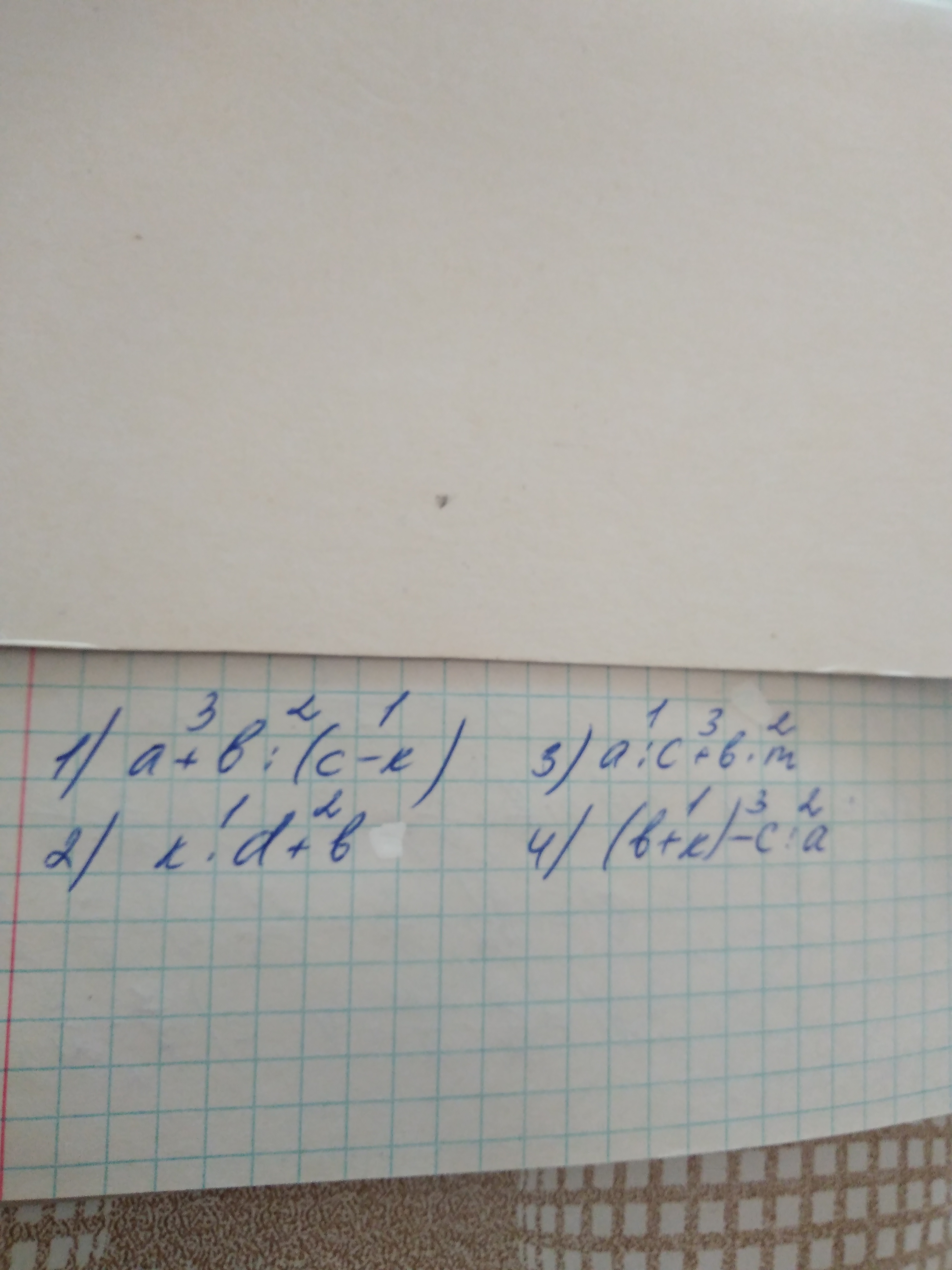 Определи порядок выполнения действий a + b : (c -k), k*d+b, a : c + b * m, (b + k) — c : a