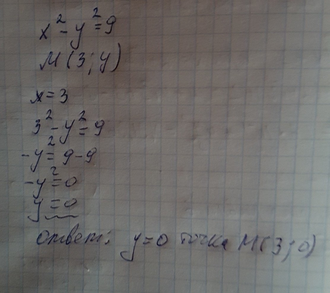 ПРИ КАКОМ ЗНАЧЕНИЕ У ТОЧКА М(3;у) принадлежит графику уравнения х2-у2=9