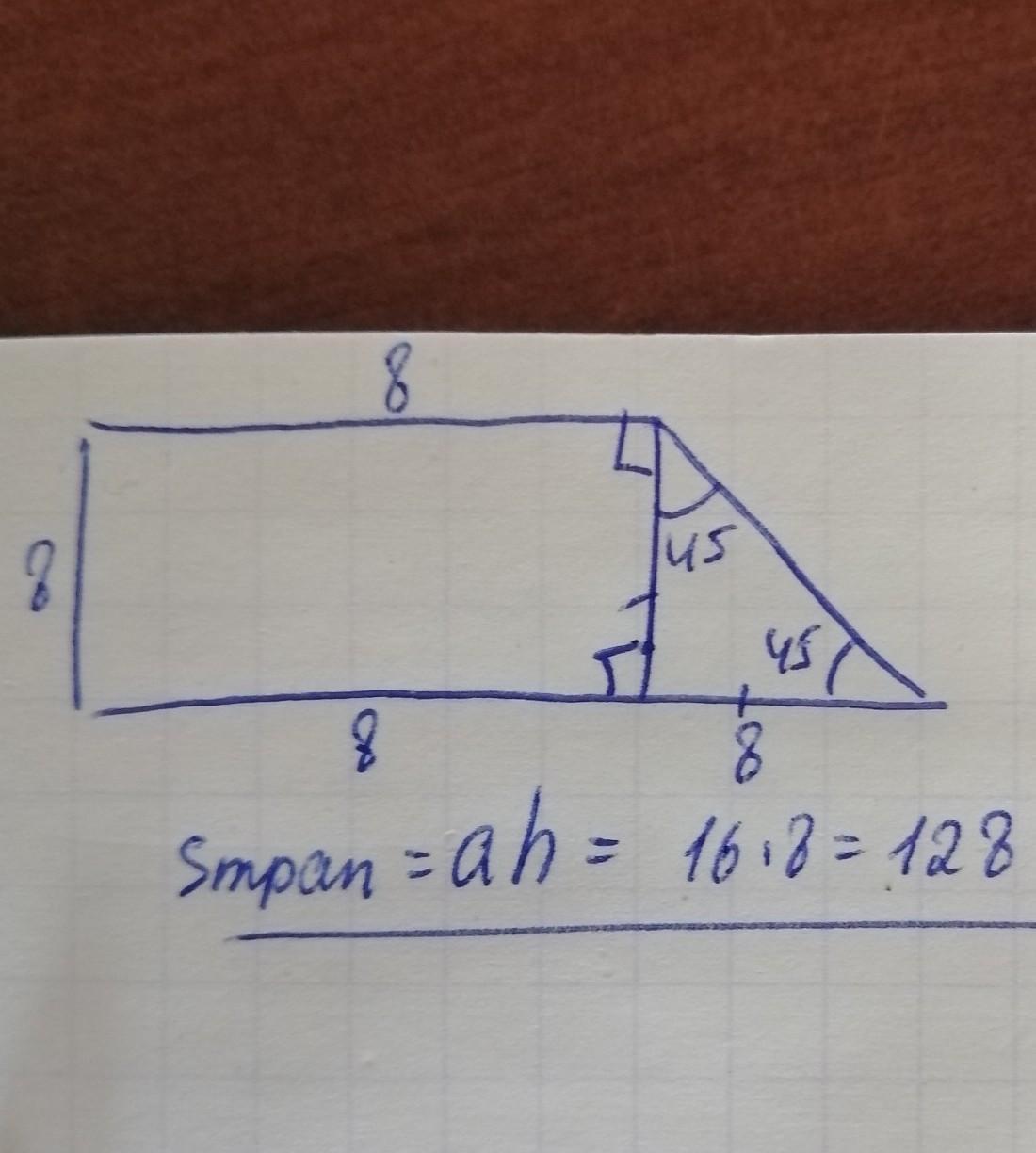 Наврал, сорри, площадь равна полусумме оснований на высоту (8+16)/2*8=96