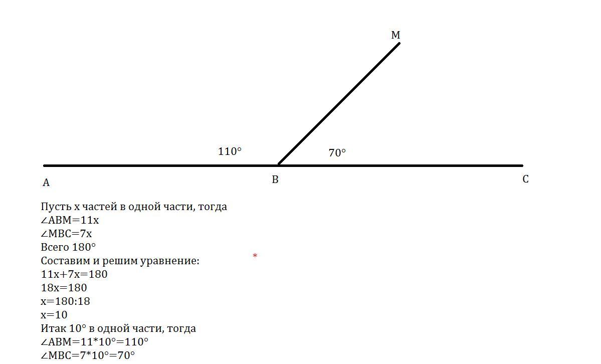 11 ч.+7 ч.=18 ч., а значит 1 часть углов равна 180º:18=10º, следовательно: