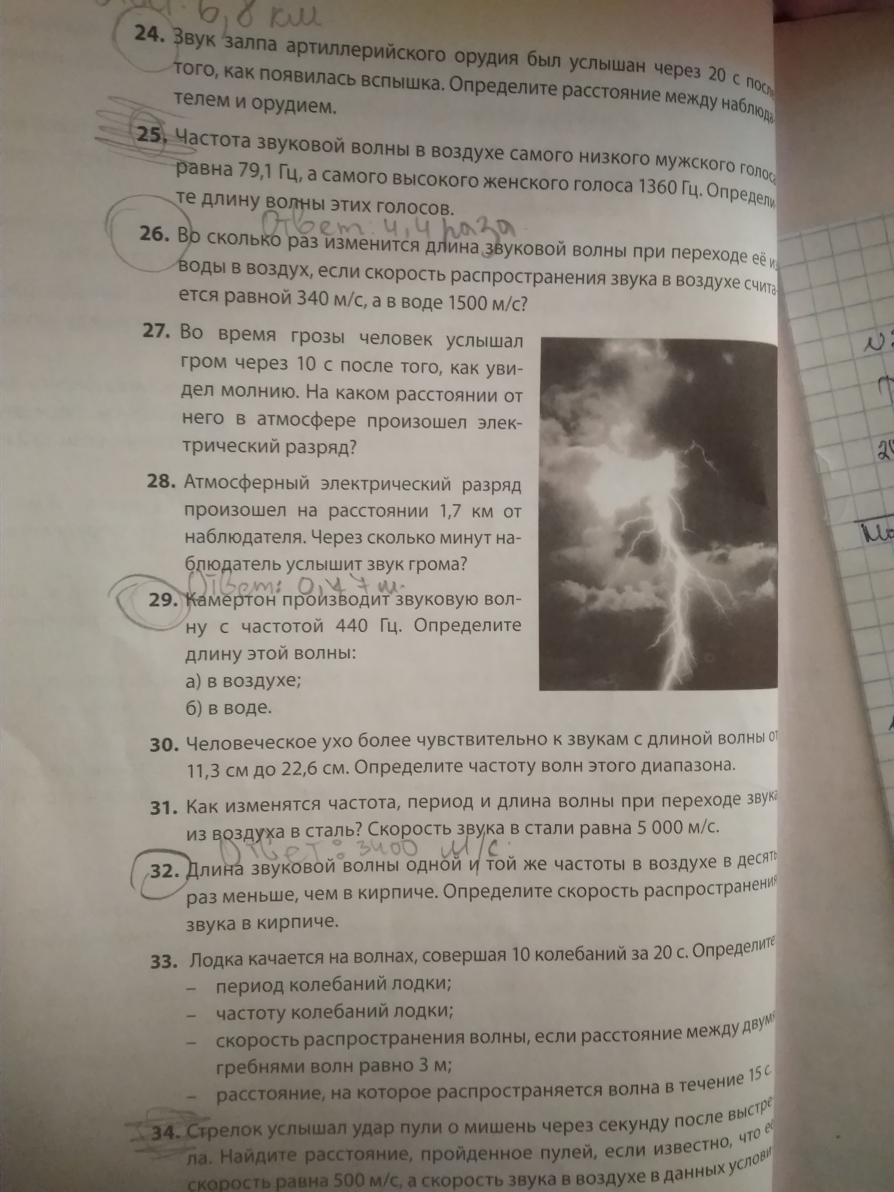 32. Lкирп=10Lвозд, f=f, Lкирп/Lвозд= Vкирп/Vвозд, Vкирп=10*340 м/с