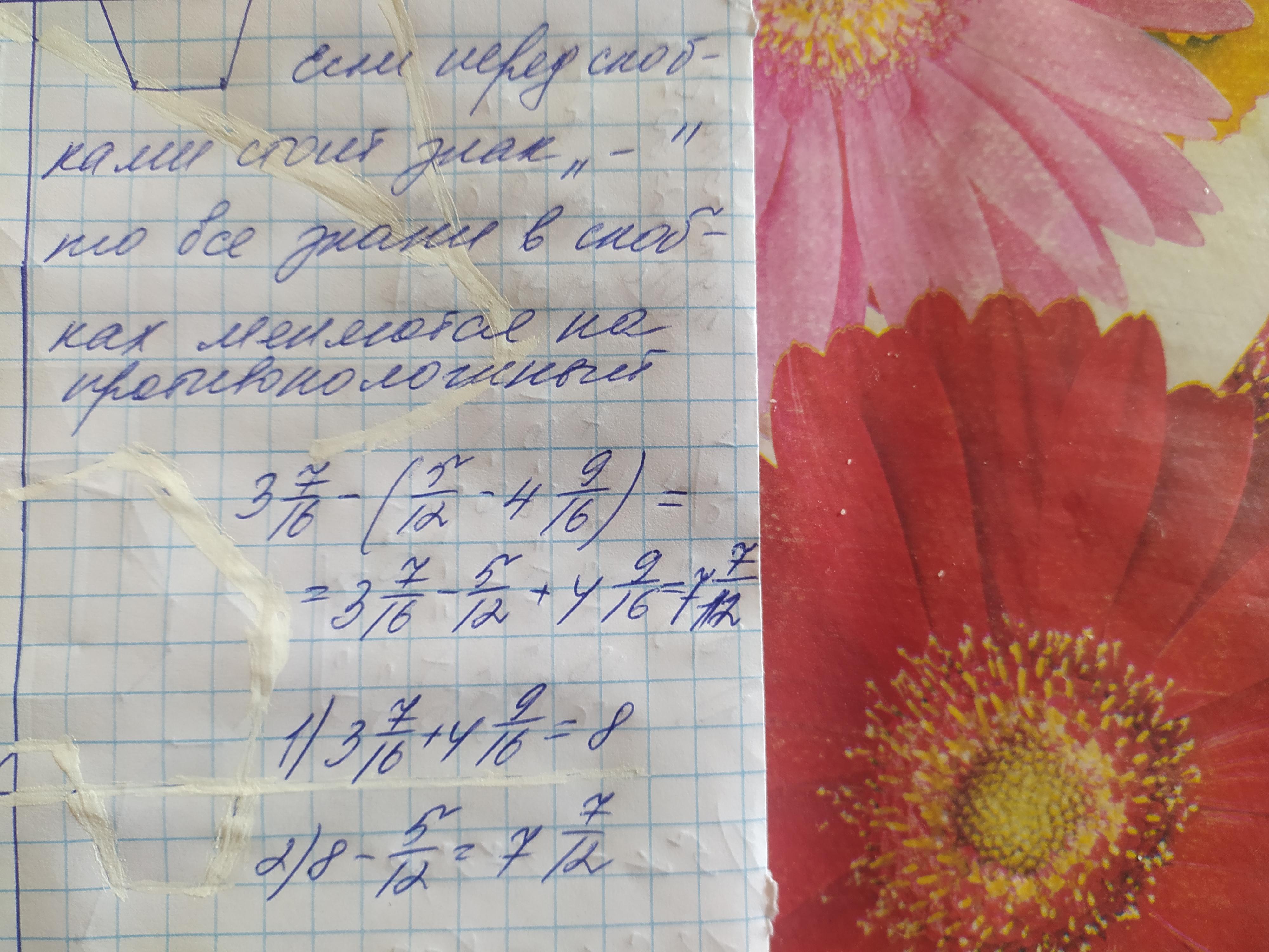 Нужна помощь с задачей по Здравия! помогите решить выражение с раскрытием скобок: 3 7/16 - (5/12 - 4 9/16) желательно пошаговое объяснение. Спасибо!? Получите подробные решения и обсуждения от других участников для школьников 5 - 9 класс. Ответы на этот вопрос уже добавлены. Мы приглашаем вас задать свой вопрос и стать экспертом для других.