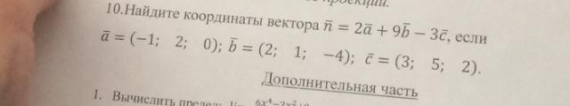 n = (2*(-1); 2*2; 2*0) + (9*2; 9*1; 9*(-4)) — (3*3; 3*5; 3*2) = (-2;4;0) + (18;9;-36) — (9;15;6) = (25; 28; -30)
