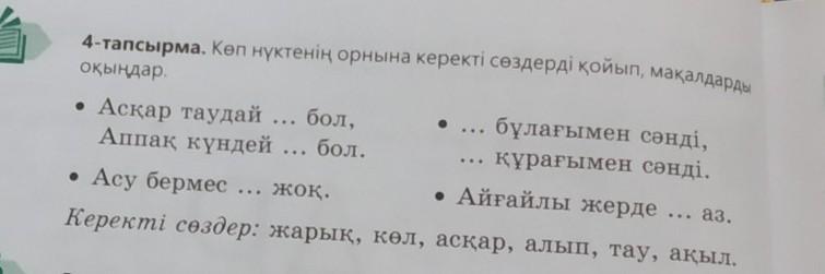 Ищете ответы на вопрос по коп нуктенин орнына керекти создерди койып макалдарды окындар помогите дам 20 балов! для 1 - 4 класс? На странице собраны решения и советы по предмету Қазақ тiлi, а также обсуждения от других участников. Ответы на этот вопрос уже есть. Вы можете задать свой вопрос, а также стать частью нашего сообщества экспертов.