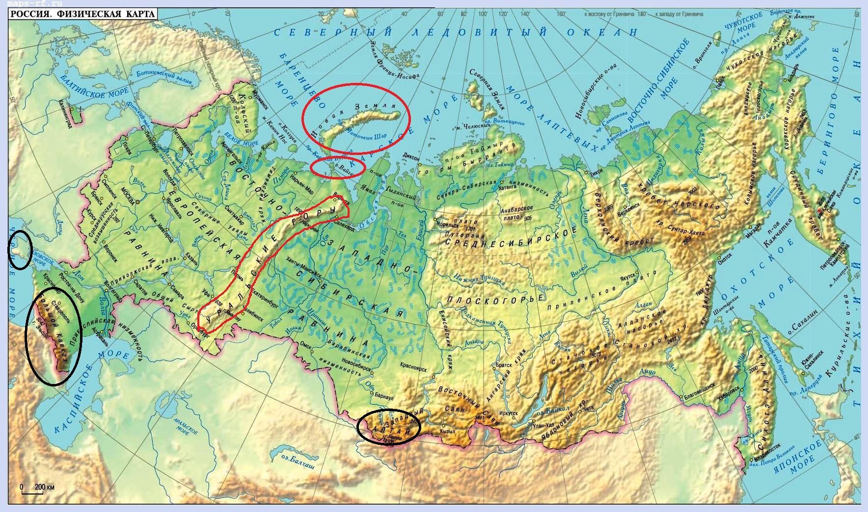 А Крымские и Кавказские горы расположены на юге в европейской части России в районе Черного (Крымские и Кавказ) и Каспийского (Кавказ) морей.