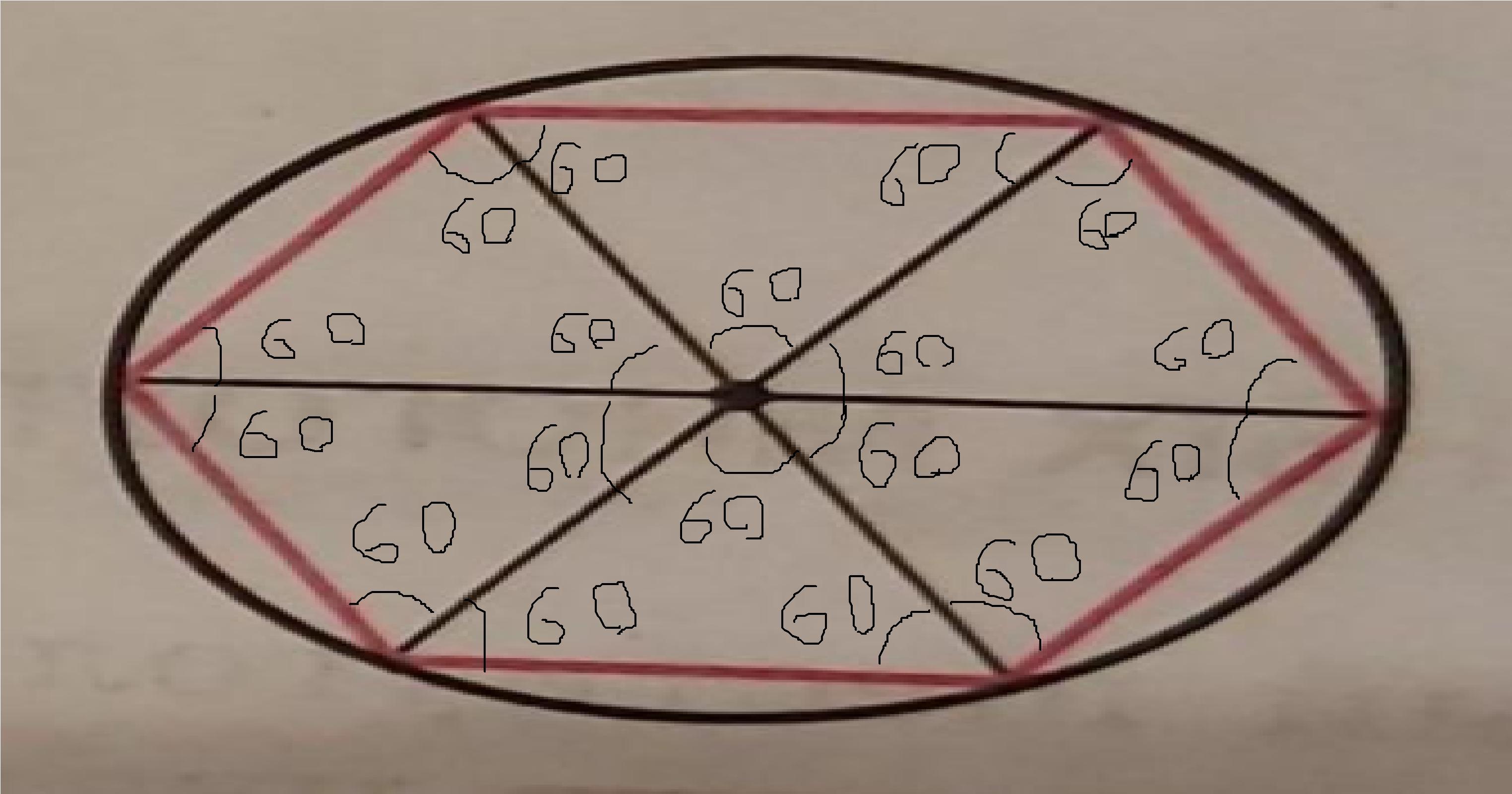 Далее получившуюся сумму делим на количество углов. В качестве примера приведу правильный шестиугольник —