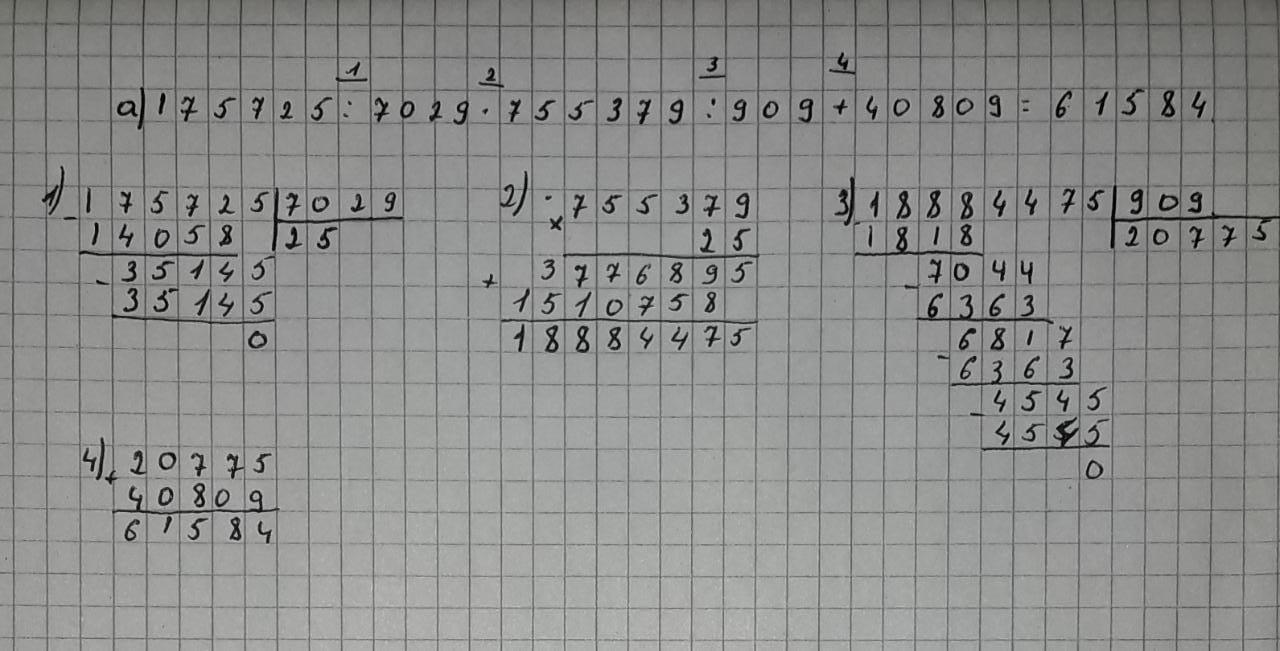Задача по VIII. Тренируемся 1) Вычислите a) 175 725 : 7029 · 755 379 : 909 + 40 809 для школьников 5 - 9 класс? Читайте обсуждения и ответы на тему Математика. Ответы на этот вопрос уже есть. Присоединяйтесь к нам, задавайте вопросы и делитесь своими знаниями с другими участниками.