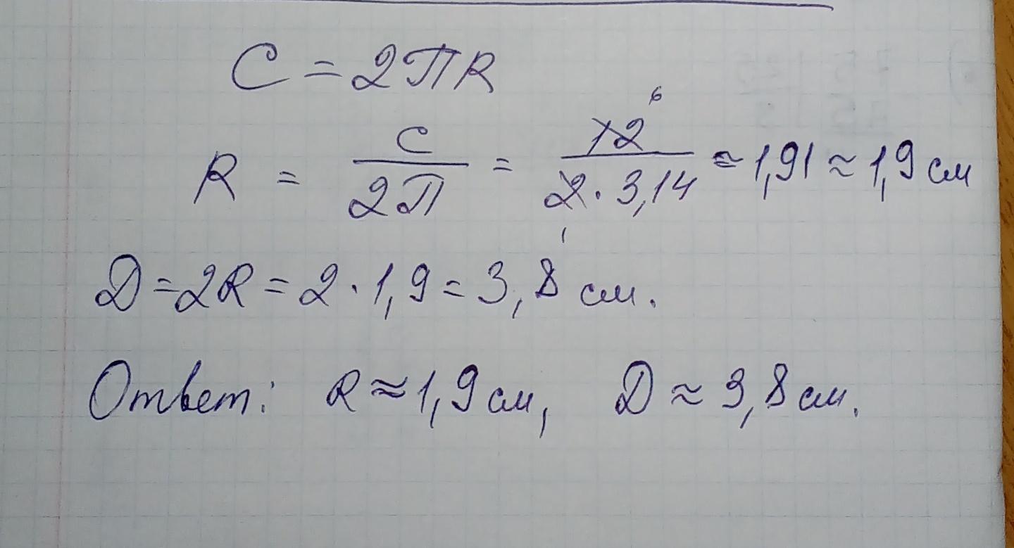 Решение задачи по вичеслите диаметр и радиус окружности если длина окружности C= 12 см для школьников 5 - 9 класс. Узнайте, как решить задачу, читайте обсуждения и ответы на тему Математика. Ответы на этот вопрос уже добавлены. Наш сайт предоставляет вам возможность задавать вопросы и помогать другим стать лучше.