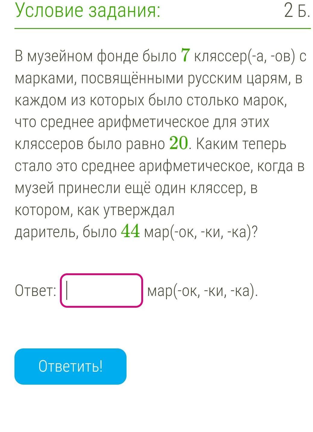 3) 184 : 8 = 23 марки — среднее арифметическое получилось после того, как в музей принесли восьмой кляссер.