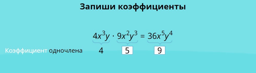 1 одночлен: коэффициент 4, степень 4. 2 одночлен : коэффициент 9, степень 5. 3 одночлен : коэффициент 36, степень 9.