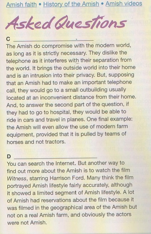 Look at these questions from a website about the Amish community in North America. Read the website and match the questions with the answers.