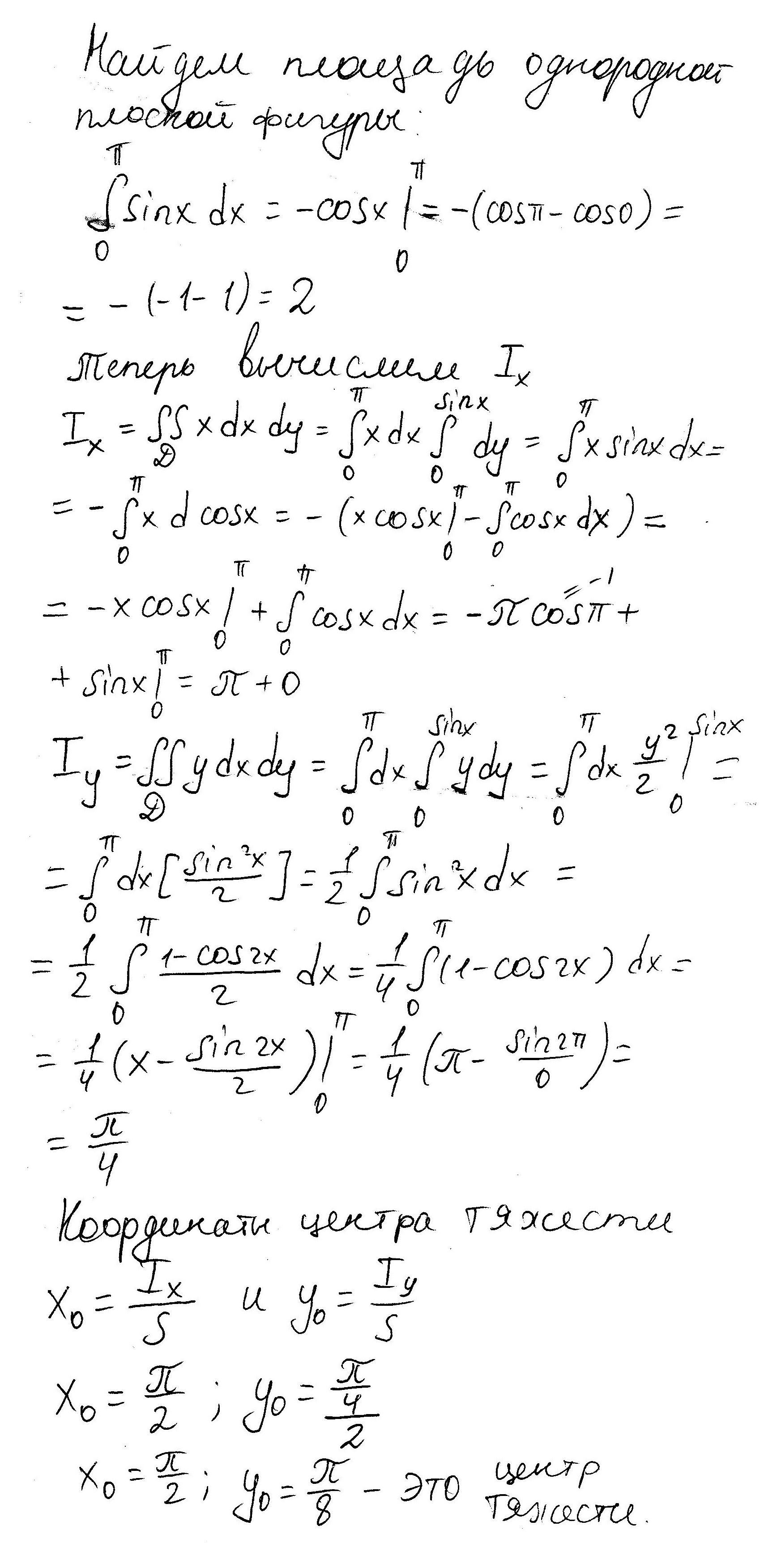 Ответы на задачу по Найти координаты центра веса однородной плоской фигуры, ограниченной дугой синусоиды y=sin x и отрезком вехе Ox от x1=0 к x2=п (число пи). для школьников студенческий. Прочитайте множественные решения и обсудите подходы с участниками. Ответы на этот вопрос уже есть. На нашем сайте вы можете задать свой вопрос и стать частью сообщества экспертов, помогая другим.