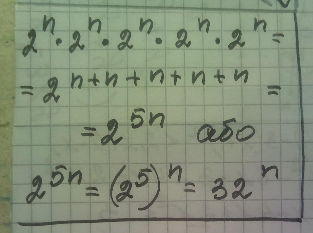 Ищете решение задачи по 4. Спрости вираз 2^n×2^n×2^n×2^n×2^n для 5 - 9 класс? На странице вы найдете не только подробное объяснение задачи, но и обсуждения от других участников. Ответы на этот вопрос уже добавлены. Этот вопрос относится к Алгебра, и помогает разобраться в теме 4. Спрости вираз 2^n×2^n×2^n×2^n×2^n. На нашем сайте вы можете задать собственный вопрос и получить помощь от опытных экспертов.