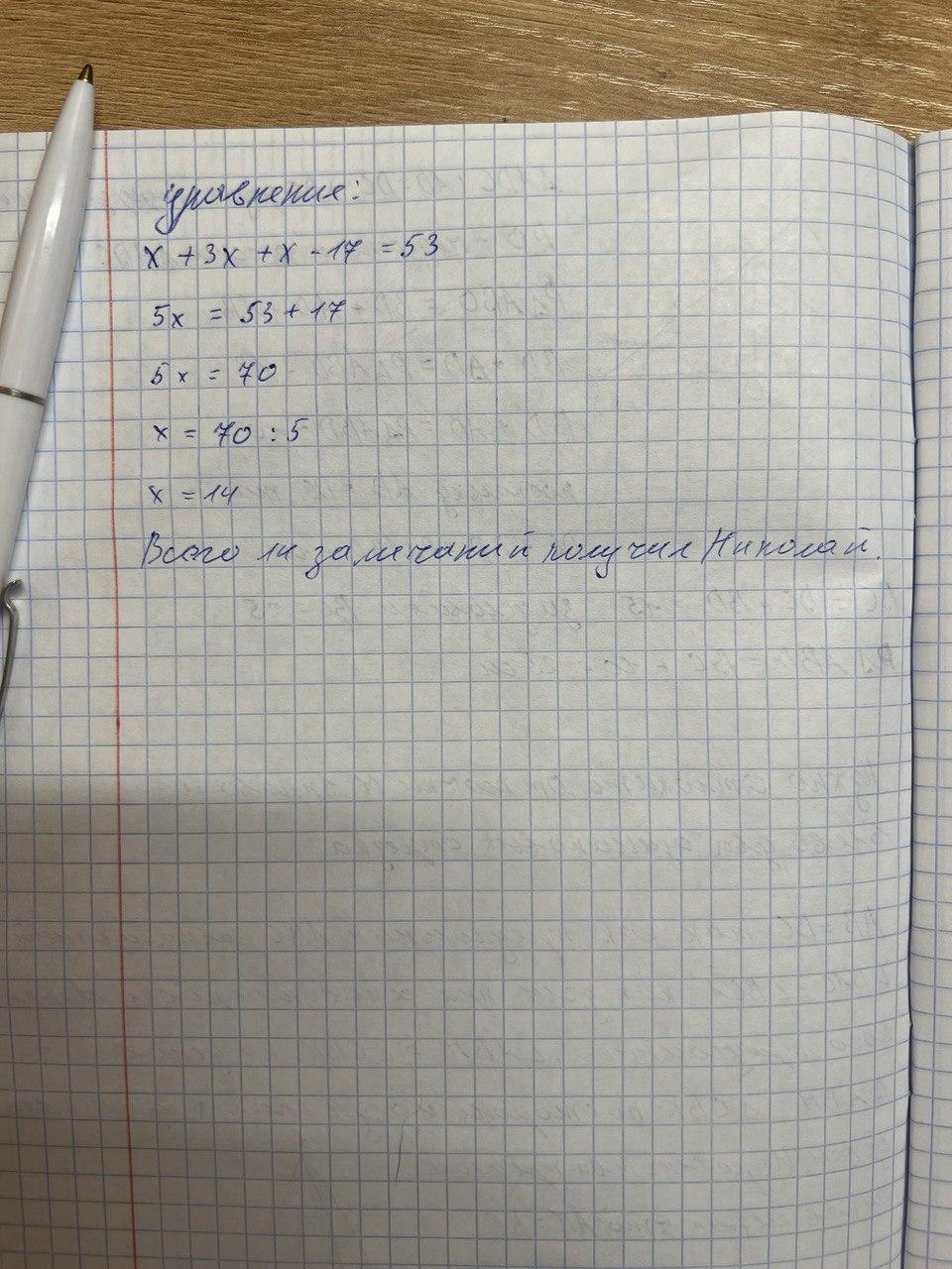 Ищете решение задачи по 334. Староста группы Никита подсчитал, что в течение первой четверти Намазбай, Курванджан и Николай получили 53 замечания от учителей. Сколько замечаний получил Николай, если он получил в три раза меньше замечаний, чем Намазбай, и на 17 замечаний больше, чем Курванджан для студенческий? На странице вы найдете не только подробное объяснение задачи, но и обсуждения от других участников. Ответы на этот вопрос уже добавлены. Этот вопрос относится к Математика, и помогает разобраться в теме 334. Староста группы Никита подсчитал, что в течение первой четверти Намазбай, Курванджан и Николай получили 53 замечания от учителей. Сколько замечаний получил Николай, если он получил в три раза меньше замечаний, чем Намазбай, и на 17 замечаний больше, чем Курванджан. На нашем сайте вы можете задать собственный вопрос и получить помощь от опытных экспертов.