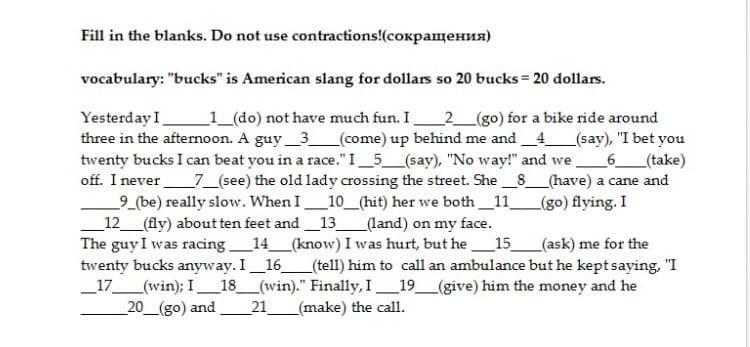 Yesterday I 1) DID not have much fun. I 2) WENT for a bike ride around three in the afternoon. A guy 3) CAME up behind me and 4) SAID, «I bet you twenty bucks I can beat you in a race.» I 5) SAID, «No way!» and we 6) TOOK off. I 7) HAD never SEEN the old lady crossing the street. She
