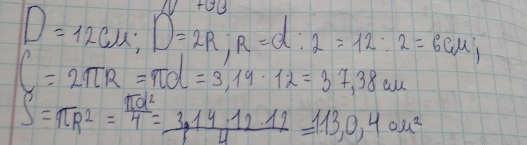 Діаметр круглого диска дорівнює 12 см. Знайдіть довжину кола, що обмежує диск, і площу цього диска