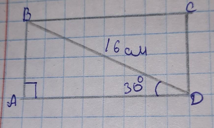 Сторона лежащая против угла в 30 градусов равна половине гипотенузы, поэтому в прямоугольном треугольнике ABD АВ=1/2*16= 8см