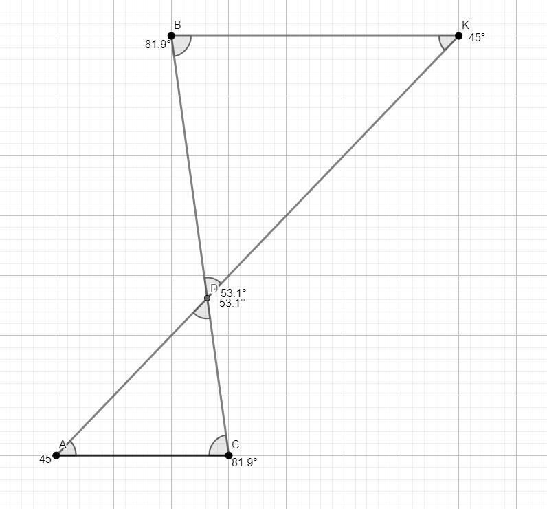 Пусть ΔBKD подобен ΔCAD (∠BKD=∠DAC, ∠DBK=∠DCA, ∠ADC=∠KDB). По условию, BK>AC. Верно ли утверждение: BD>DC, DK>AD?