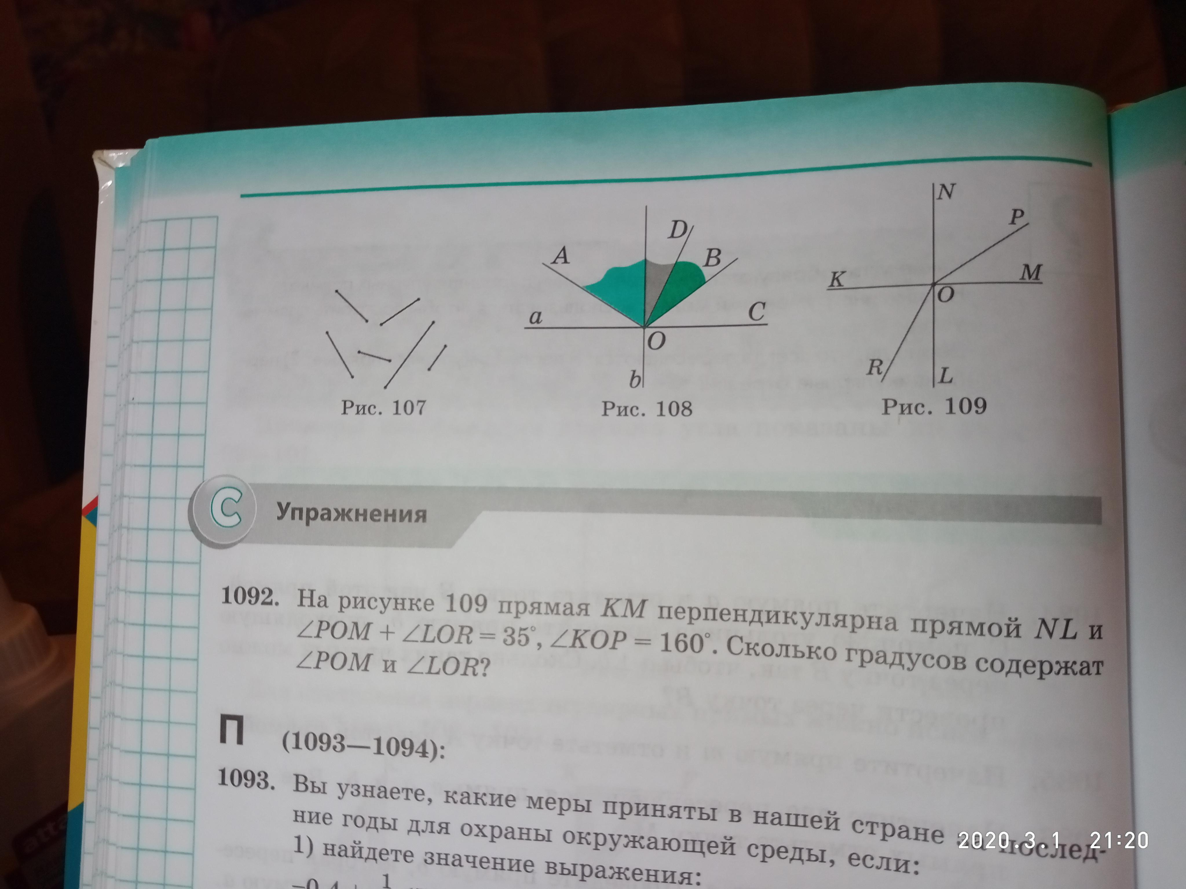 2) Так как мы знаем сумму углов ∠POM и ∠LOR = 35°, то ∠LOR = 35° — ∠POM ⇒ ∠LOR = 35° — 20° = 15°